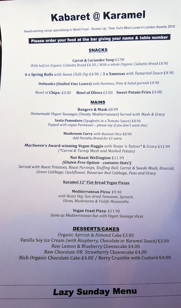 Welcome to Karamel N22 Collage Arts, a hidden gem nestled in the heart of London. Known for its vibrant atmosphere, this venue combines delectable vegan cuisine with live entertainment for an unforgettable experience. Patrons rave about the Sunday roasts, particularly the scrumptious almond wellington adorned with rustic trimmings like roasties and green vegetables. Vegans will delight in options like the delectable "chicken" and mushroom pie and the sumptuous apple crumble praised by many.